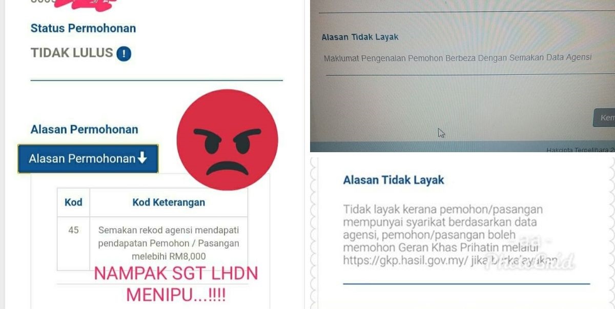 Antara lain ialah tidak layak kerana pemohon / pasangan mempunyai syarikat berdasarkan data agensi, pemohon/ pasangan boleh memohon Geran Khas Prihatin melalui https://gkp.hasil.gov.