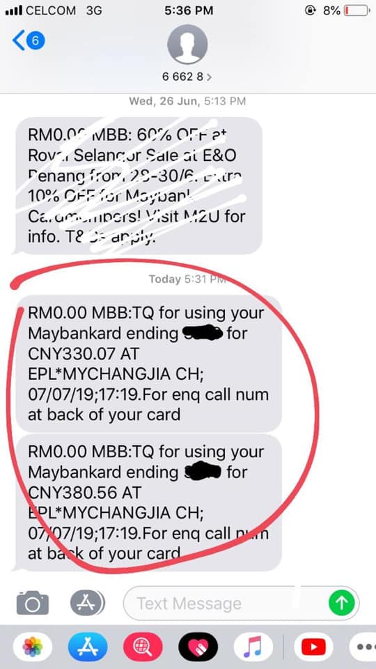 Lepas tu masuk pula dua mesej potongan Maybank, satu CNY330.07 dan satu lagi CNY380.56 (CNY ini mungkin matawang China).
