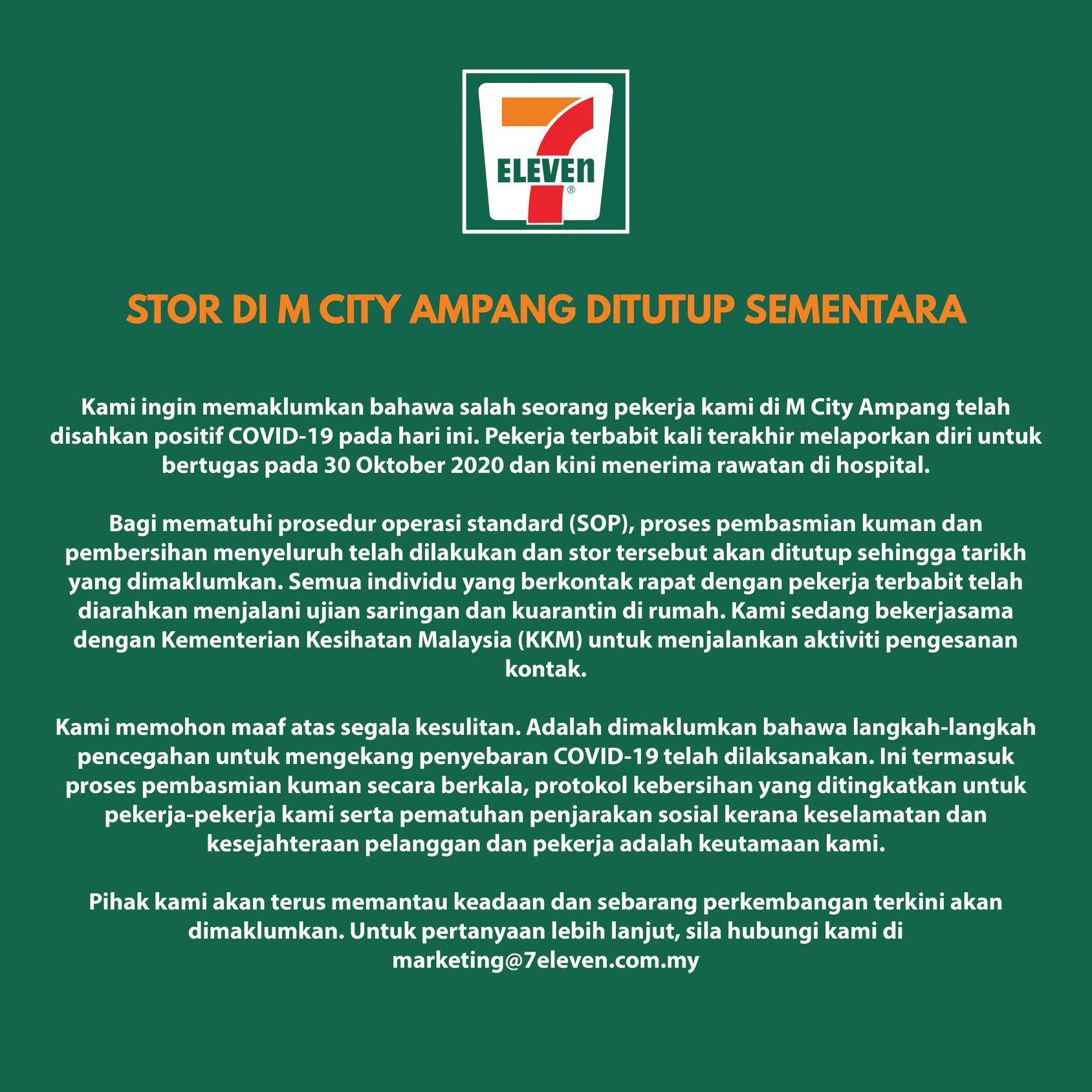 Terbaru, seorang pekerja kedai serbaneka 7-Eleven di M City Ampang disahkan COVID-19. Pekerja terbabit kali terakhir melaporkan diri untuk bertugas pada 30 Oktover 2020 dan kini menerima rawatan di hospital. Semua individu yang berkontak rapat dengan pekerja terbabit telah diarahkan untuk menjalani ujian saringan dan kuarantin di rumah sehingga kebenaran diberikan oleh pihak berkuasa.