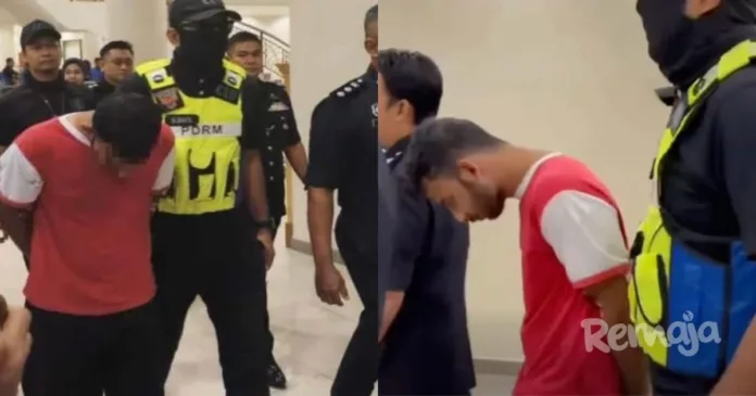 Dia dilihat memakai kemeja-T merah berlengan putih, tangan bergari serta dikawal ketat anggota polis sepanjang pergerakan memasuki bangunan mahkamah.