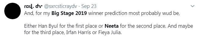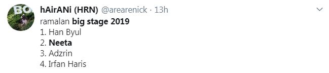 Apapun, tahniah REMAJA ucapkan kepada 5 finalis yang layak ke konsert terakhir. Di ruangan media sosial, Big Stage 2019 yang sekali lagi menjadi trending semalam bertukar meriah dengan ramalan oleh penonton akan siapa di antara mereka berlima yang bakal membawa pulang kejuaraan.