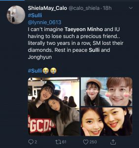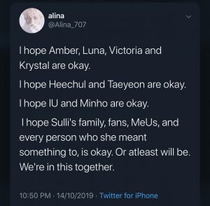 Peminat turut berharap rakan-rakan rapat seperti Taeyeon, IU, Krystal, Heechul, Minho dan yang ‘Closed’ dengan Sulli tabah menerima dugaan dan kehilangan Sulli.
