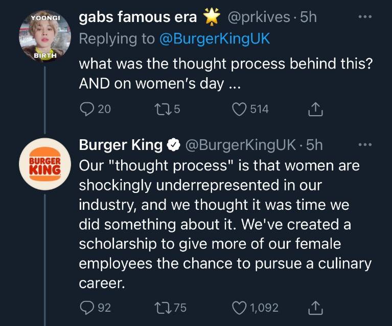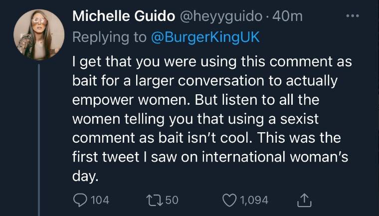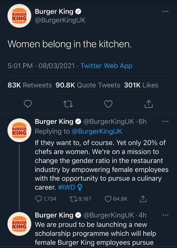 Sempena sambutan Hari Wanita Sedunia yang jatuh pada 8 Mac 2021 semalam (atau hari ini mengikut zon masa negara Barat), Burger King telah mengambil keputusan untuk memuat naik ciapan berbunyi,