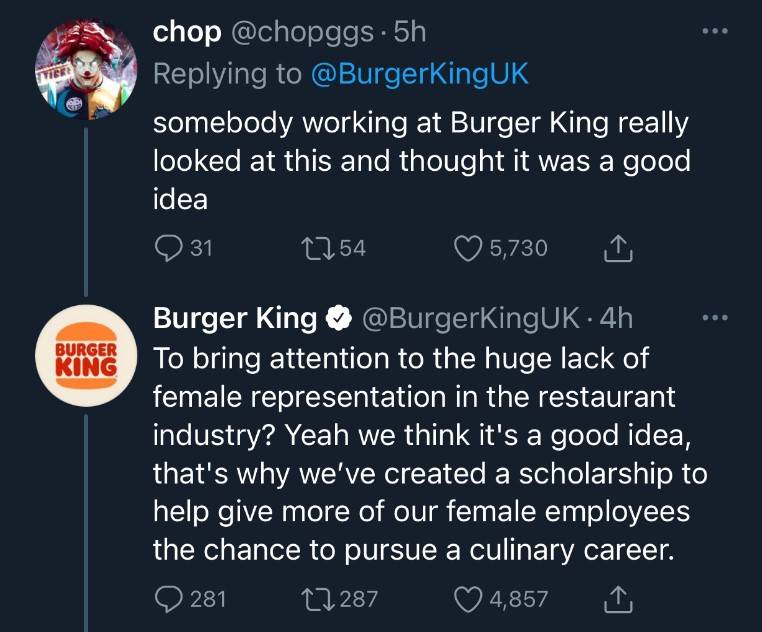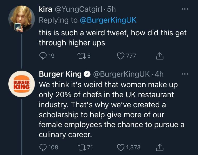 Niat jenama perniagaan makanan segera antarabangsa, Burger King UK mungkin adalah untuk mendapatkan perhatian pengikut akaun Twitter mereka terutamanya di kalangan perempuan.