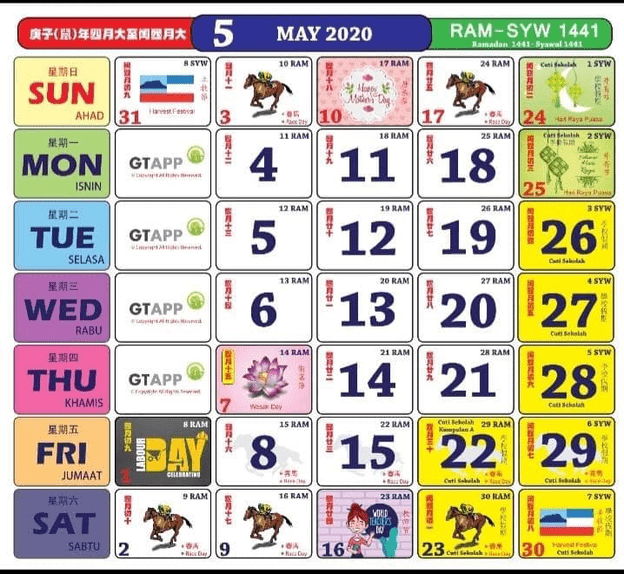 11 Mei (Isnin) – Cuti Nuzul Al-Quran (Kuala Lumpur, Labuan, Pahang, Pulau Pinang, Perak, Perlis, Putrajaya