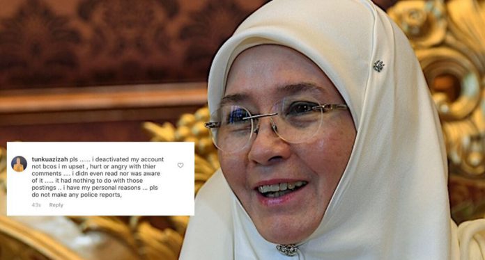 “Saya menyah-aktifkan akaun bukan kerana sedih, terasa atau marah pada komen-komen mereka. Saya sendiri tidak membaca dan sedar mengenai perkara itu. Ia tiada kaitan. Saya ada sebab peribadi, tolong jangan buat laporan polis,’’ titah Tunku Azizah.