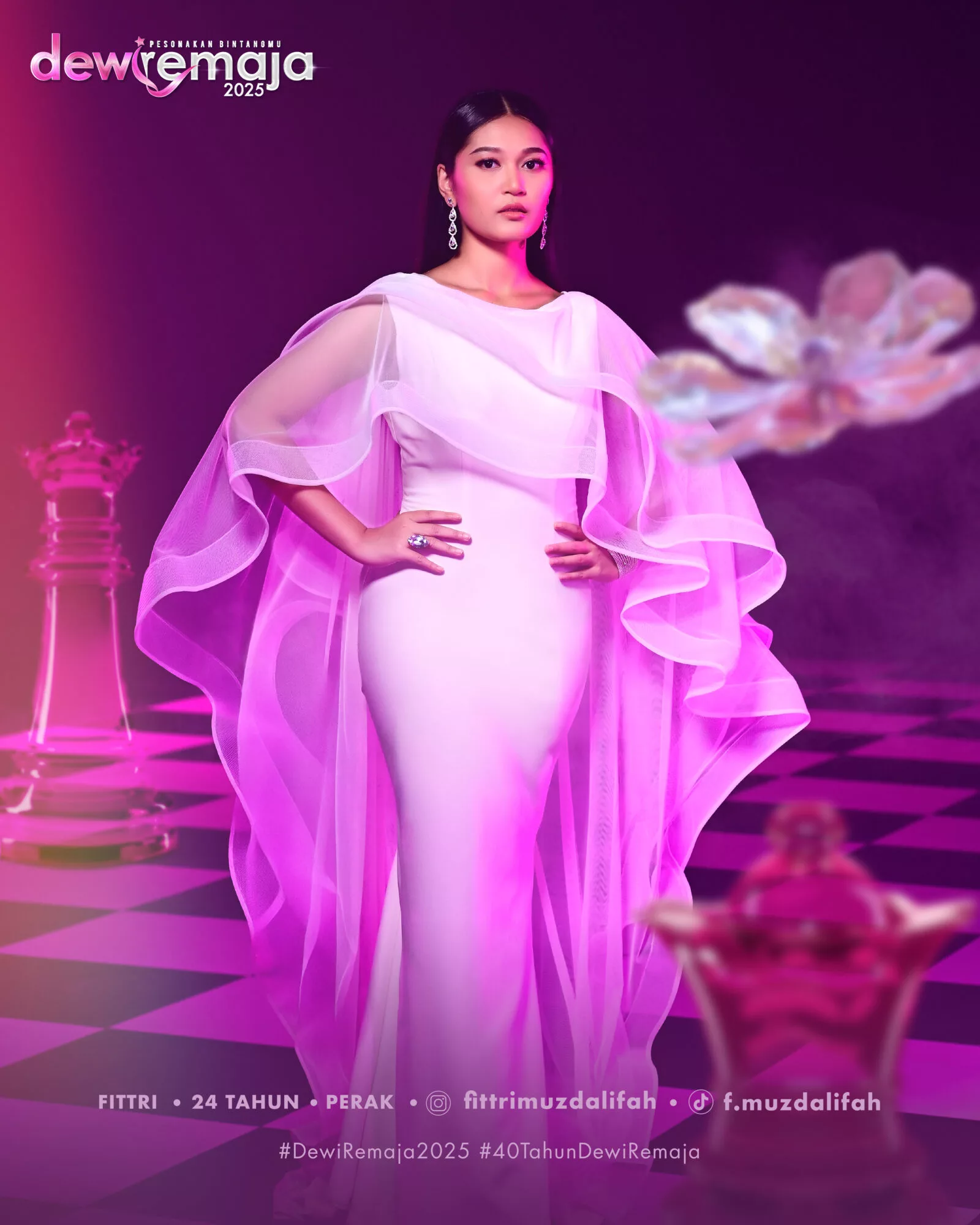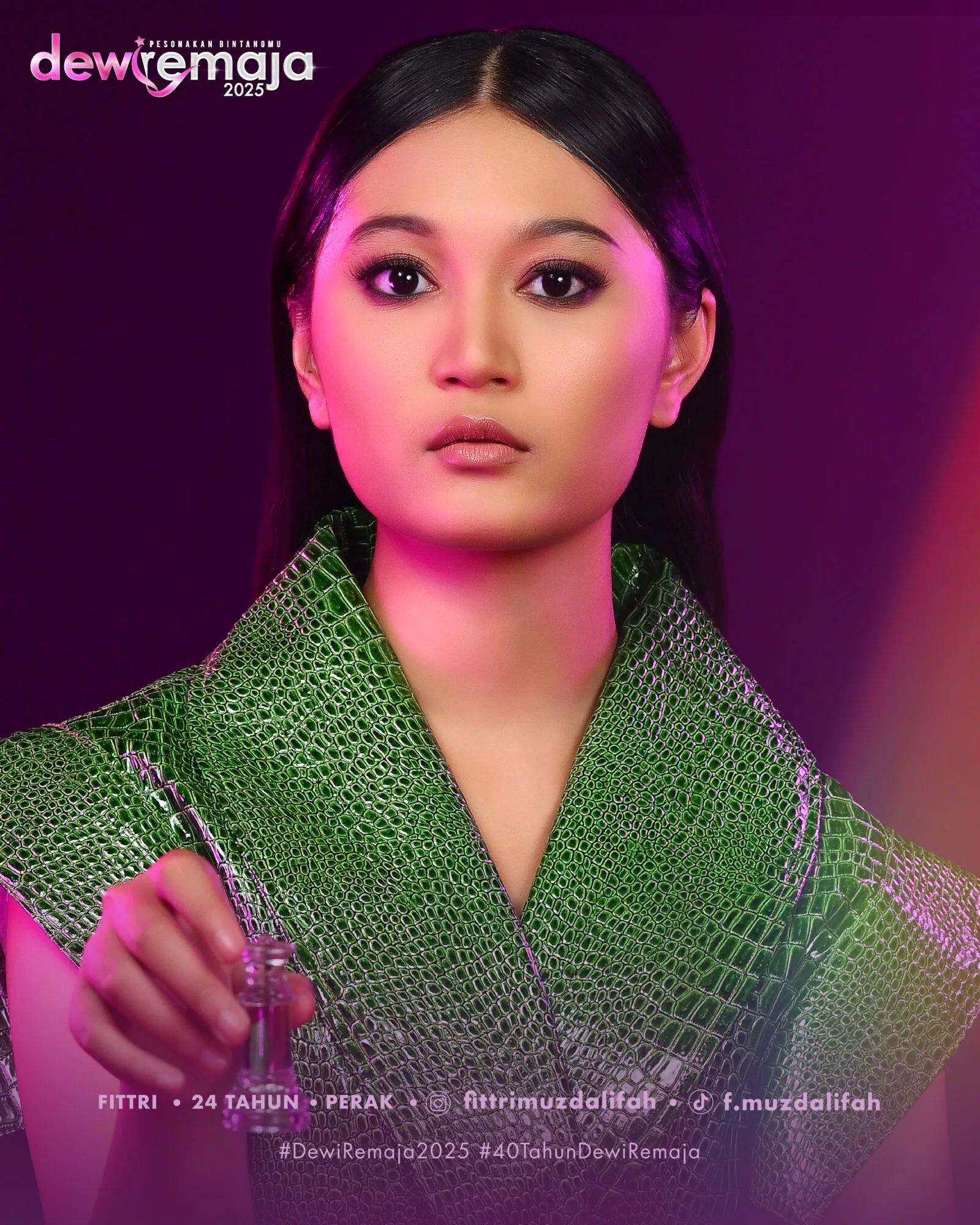 Nama : Fittri Muzdalifah Binti IbrahimAsal : Ipoh, Perak (Menetap di Selangor)Umur : 24 TahunTarikh Lahir : 13 Januari 2001Pendidikan : Penuntut Ijazah Sarjana Muda Pengurusan Perniagaan (UNITAR)Hobi : Menunggang kudaIdola : Maya KarinInstagram :@fittrimuzdalifahTikTok :@f.muzdalifah Anak kelahiran Ipoh, Perak ini dibesarkan oleh ibunya yang merupakan pesara pegawai khidmat pelanggan dan ibu saudara. Menariknya, Fittri membesar dalam persekitaran rumah tanpa televisyen dan lebih banyak main di luar bersama adiknya. Dari situ, Fittri menerapkan dirinya untuk mudah merasa empati terhadap insan di sekeliling walaupun dari luaran, dirinya kelihatan seperti seorang gadis yang 'outspoken'. Sewaktu zaman belajar, Fittri cuba menceburi bidang teater dan baru-baru ini sepanjang empat tahun, Fittri berpeluang untuk banyak mengambil peranan sebagai pelakon tambahan demi menambah pengalaman. Misinya menyertai pencarian Dewi Remaja 2025 adalah demi membuatkan ibunya bangga. Fittri turut ingin membuktikan bahawa seseorang boleh berjaya dengan usaha keras walaupun berasal daripada latar belakang kehidupan yang sukar.