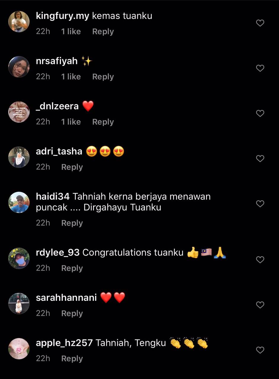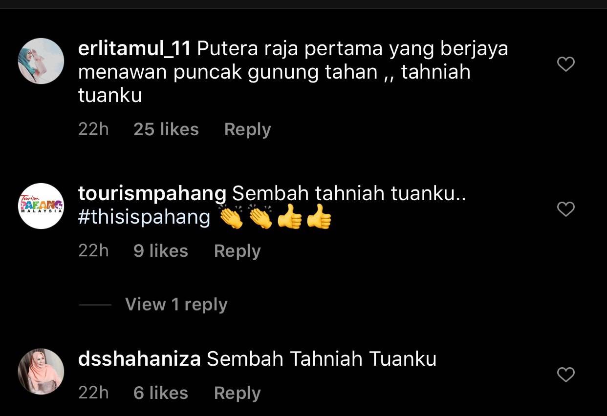 Menerusi laman Instagram, posting gambar Tengku Hassanal yang berada di puncak gunung dihujani ucapan tahniah daripada rakyat yang turut berbangga atas kejayaan baginda.