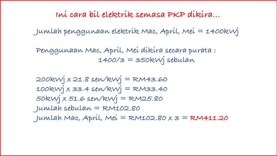 Hakikatnya, TNB membuat kiraan secara prorata dengan mengambil bacaan secara purata bagi bulan Mac, April dan Mei. Jadi, memang tak sampai pun tariff band yang tinggi itu sekiranya penggunaan pada bulan-bulan tersebut adalah sama seperti bulan sebelum PKP.