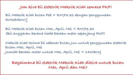 Perkongsian ini telah pun dibuat oleh seorang pengguna Facebook, Noor Afifah yang juga memberi contoh pengiraan bagaimana bil elektrik dikira. Menurut pandangannya lagi, kebanyakan pengguna di rumah menggunakan elektrik dalam tempoh PKP melebihi kebiasaannya. Maklum saja semua orang kena duduk di rumah 24 jam sehari.