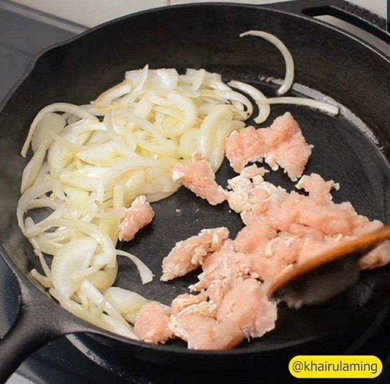 2. Masukkan isi ayam yang telah dicincang dan tumis sehingga garing sedikit.