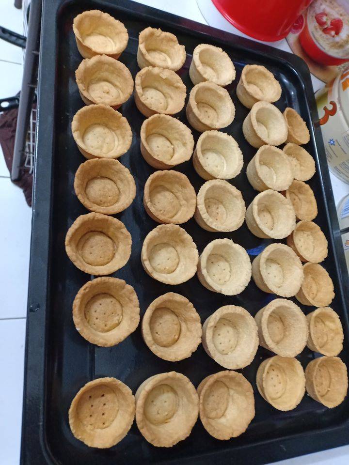 4. Masukkan ke dalam acuan tart dan trim bahagian atasnya