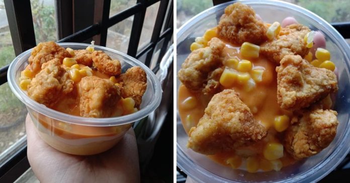 6. Akhir sekali taburkan popcorn chicken dan jagung. Siap!