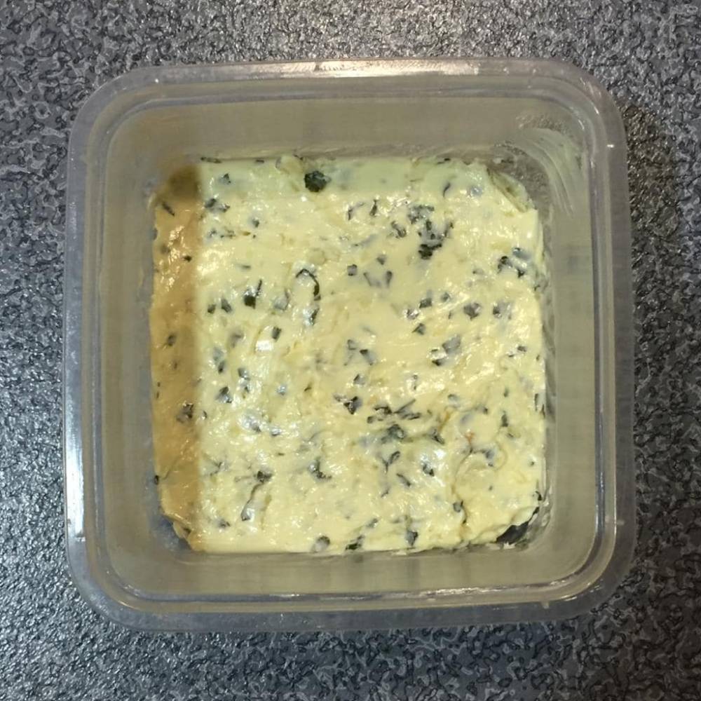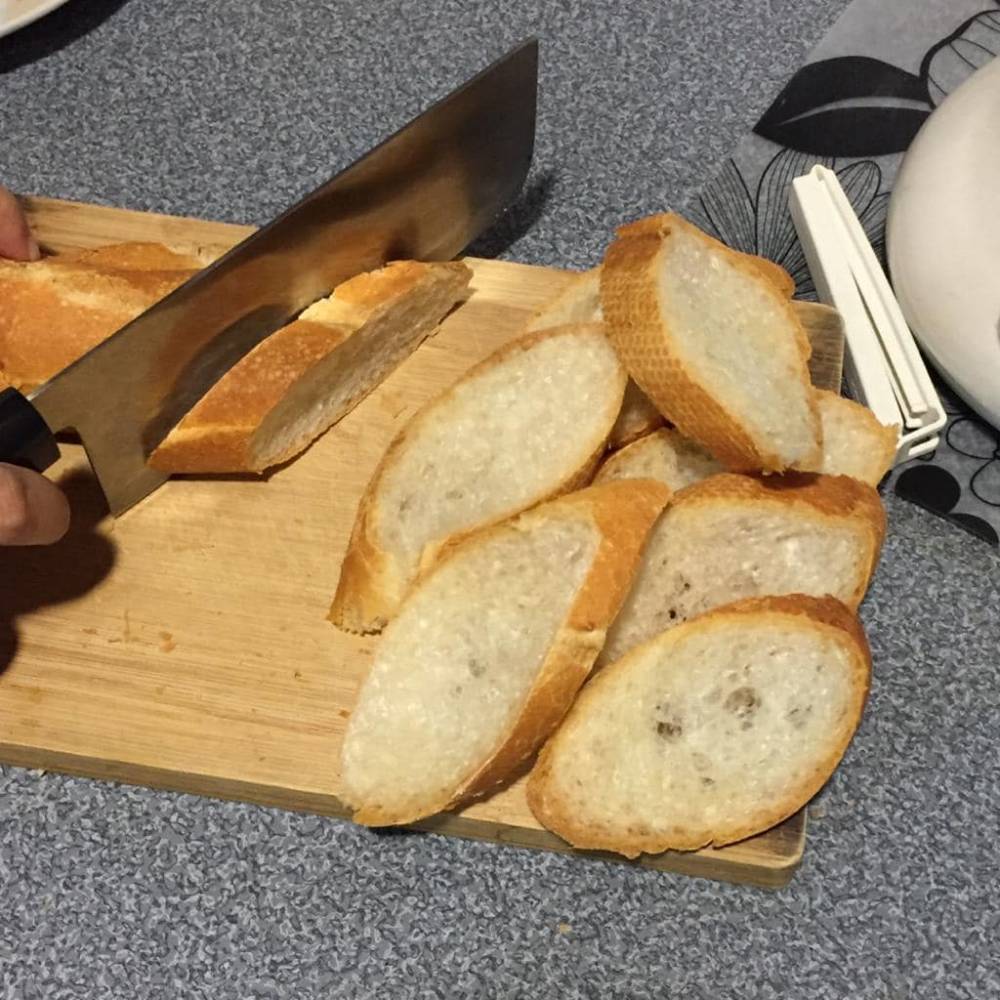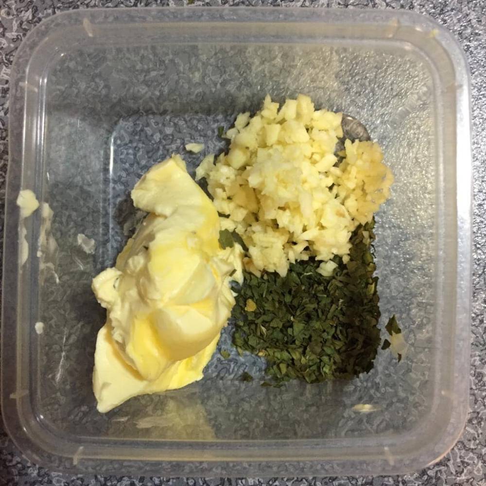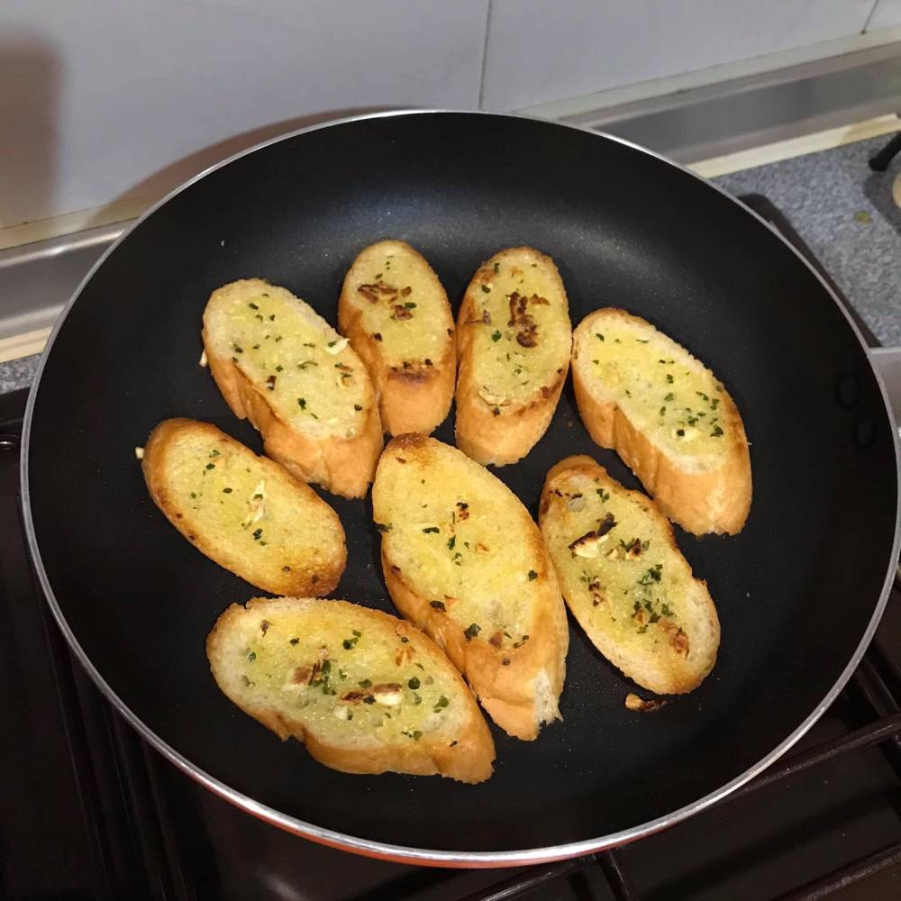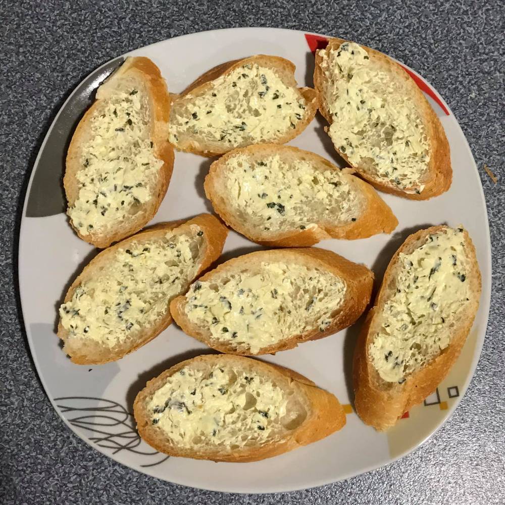 3. Kemudian, sapu campuran bawang putih, butter dan daun parsli pada sebelah bahagian roti sahaja