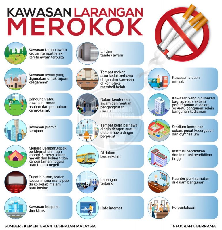 Inilah dia 23 senarai lokasi zon bebas rokok dan jika masih engkar, sabit kesalahan boleh denda RM10,000 dan penjara 2 tahun ya. Info grafik BERNAMA