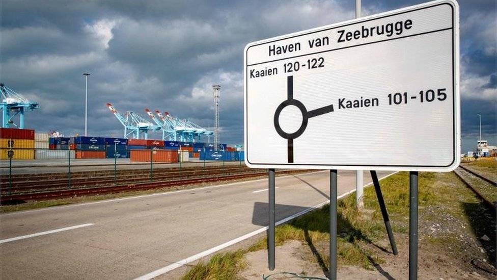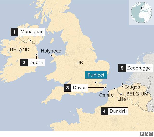 Trak treler terbabit tiba di pelabuhan Purfleet di Essex, selatan England, dari pelabuhan Zeebrugge di Bulgaria.