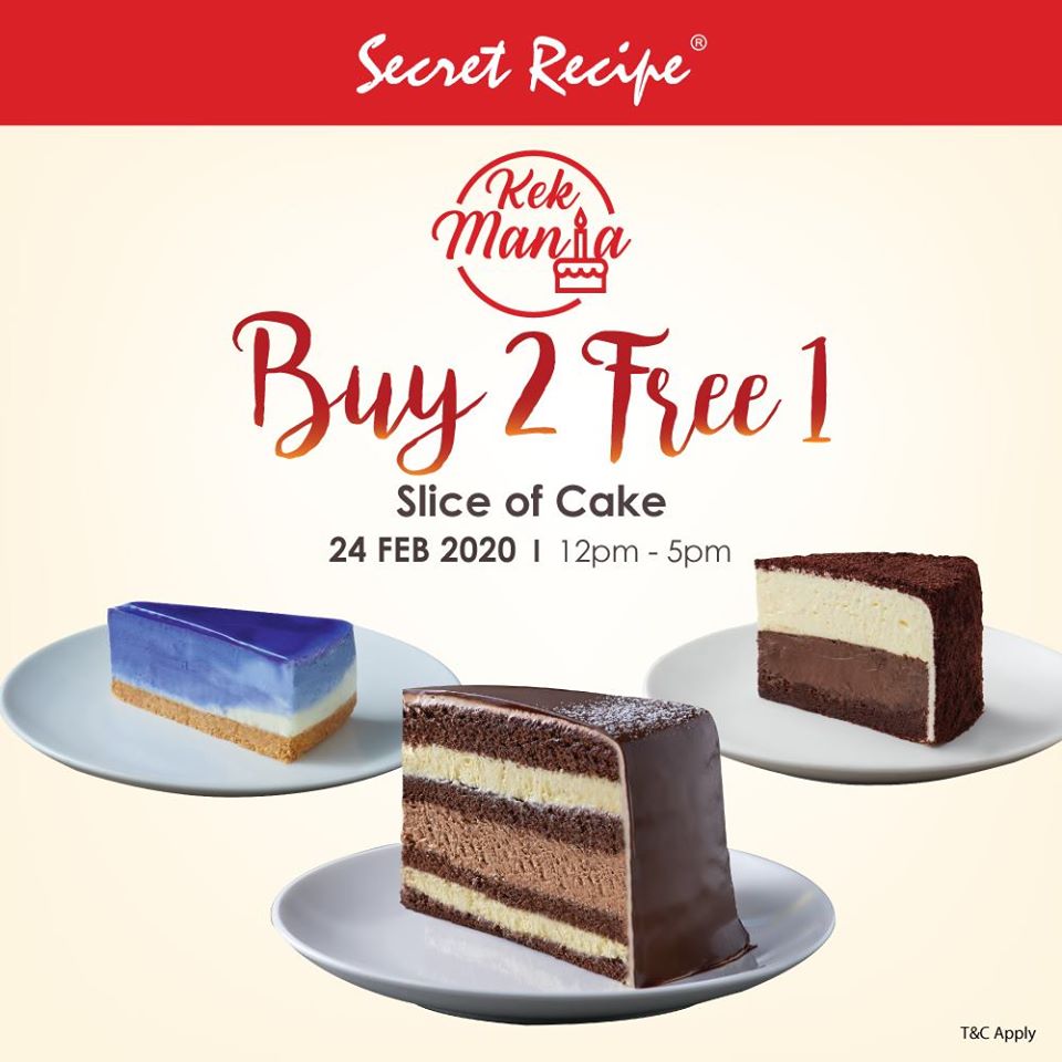 Berita baik buat peminat kek Secret Recipe, pada 24 Februari nanti korang boleh menikmati tawaran promosi beli 2 percuma 1 kek.