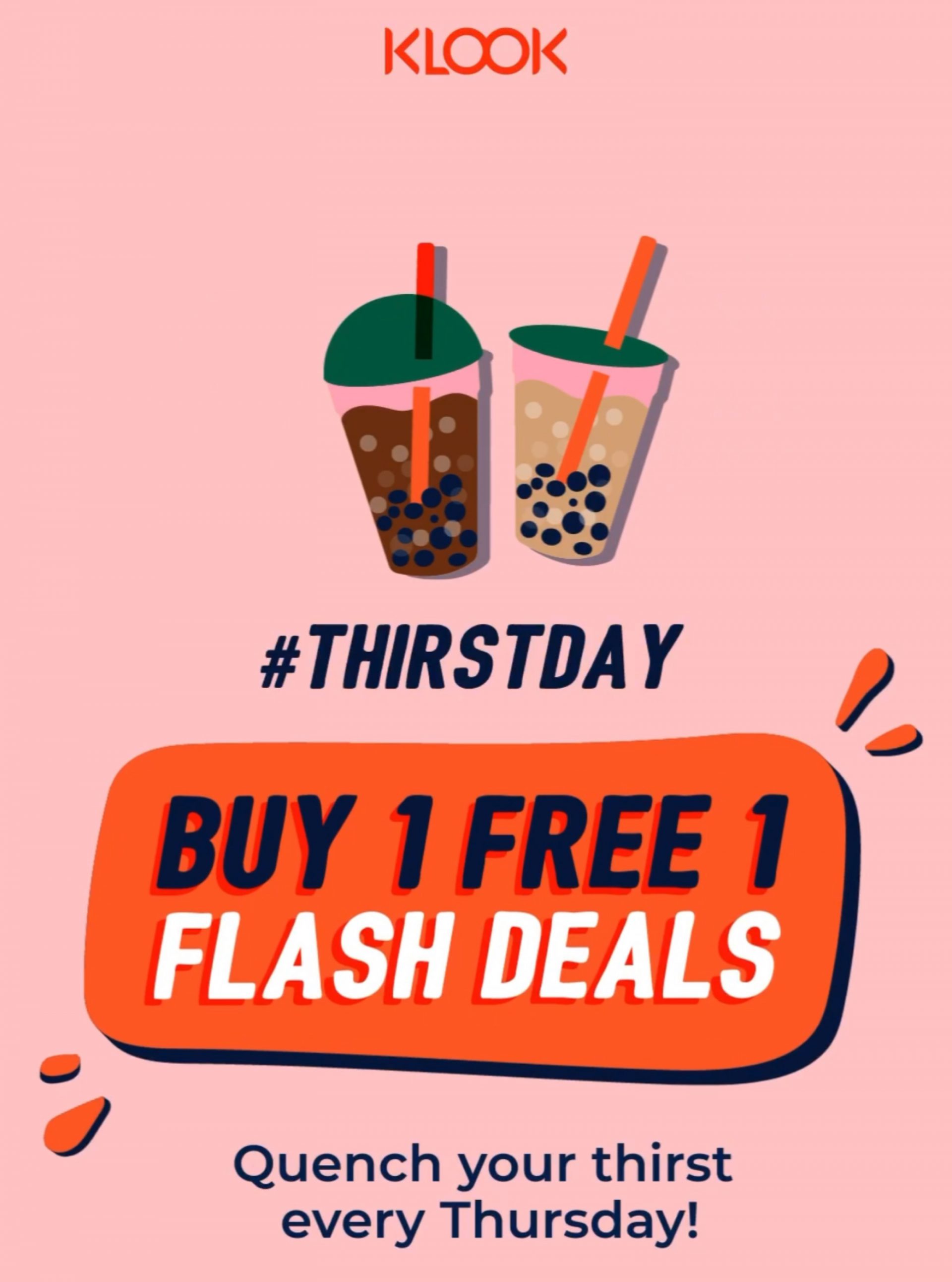 Antara promosi yang mencuri tumpuan REMAJA ialah #Thirstday. Korang boleh dapatkan minuman percuma dengan setiap pembelian minuman daripada kedai seperti Gongcha (19 Mac) dan Fire Tiger (26 Mac) dari jam 12pm hingga 2pm dengan menggunakan aplikasi KLOOK.