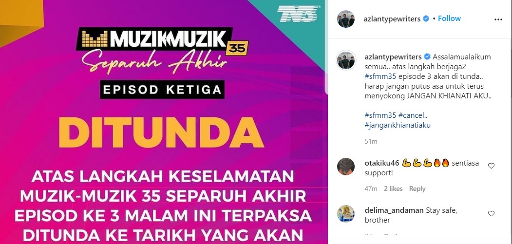 “Assalamualaikum semua. Atas langkah berjaga-jaga, Separuh Akhir Muzik-Muzik akan ditunda. Harap jangan putus asa untuk terus menyokong Jangan Khianati Aku.”