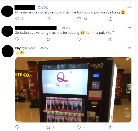 Malah, ada yang menjelaskan bahawa perniagaan hijab juga sudah dibuat melalui vending machine.