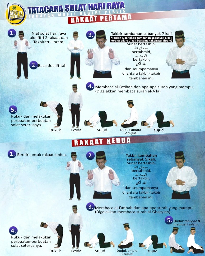 Solat sunat Aidilfitri boleh dilakukan sebanyak dua rakaat dan tanpa khutbah.