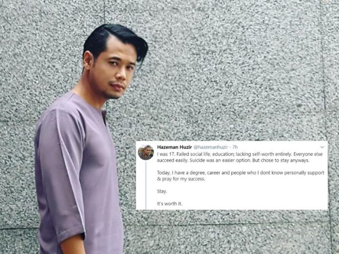 “Saya berumur 17 tahun, gagal kehidupan sosial, pelajaran, rasa rendah diri sangat. Orang lain semua berjaya dengan mudah. Bunuh diri kelihatan macam jalan yang mudah tapi saya memilih untuk tidak melakukannya.