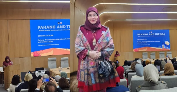 Tepat jam 9.45 pagi waktu tempatan, baginda membentangkan syarahan bertajuk “Pahang: Warisan Perlembagaan dan Maritim Melayu-Islam Yang Dilupakan”.
