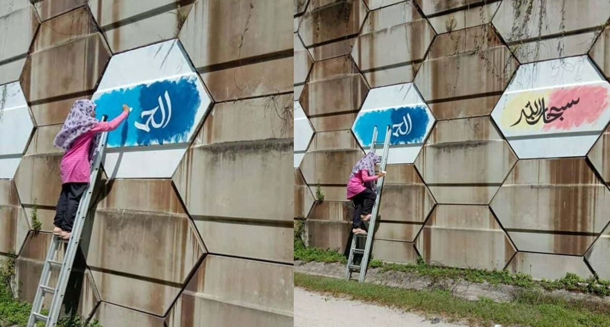 Menerusi satu perkongsian yang dibuat oleh seorang pengguna media sosial ke laman Facebook Batu Gajah Bandar Bersejarah (BGBB), kelihatan seorang gadis sedang memanjat tangga sambil menulis mural tulisan khat di dinding jambatan.