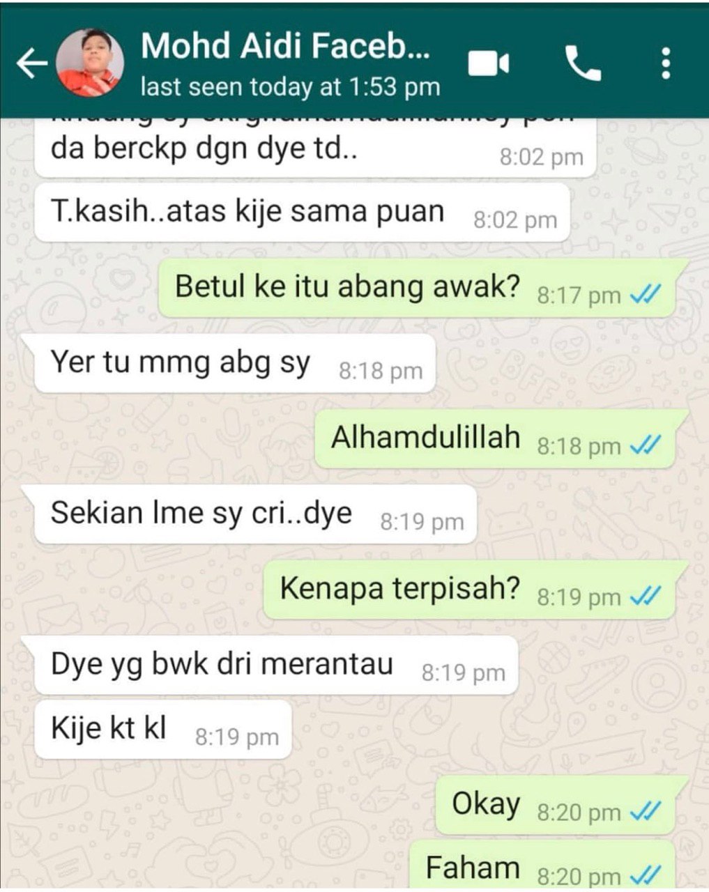 Hilang selepas merantau bekerja di Kuala Lumpur, seorang pengguna Twitter berjaya menghubungi Mohd Aidi dan bertanyakan mengenai hal tersebut. Akui gembira kerana pencarian selama ini berakhir, ibu kepada Mohd Aidi turut merasa gembira dengan perkhabaran berkenaan.