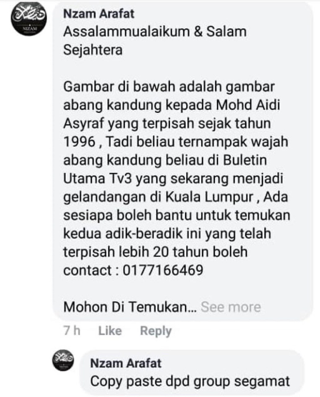 Seorang pengguna Facebook yang meninggalkan komen bahawa lelaki berkenaan merupakan abang kepada individu Mohd Aidi Asyraf, siapa sangka daripada kisah mengenai gelandangan bertukar genre kepada Jejak Kasih.