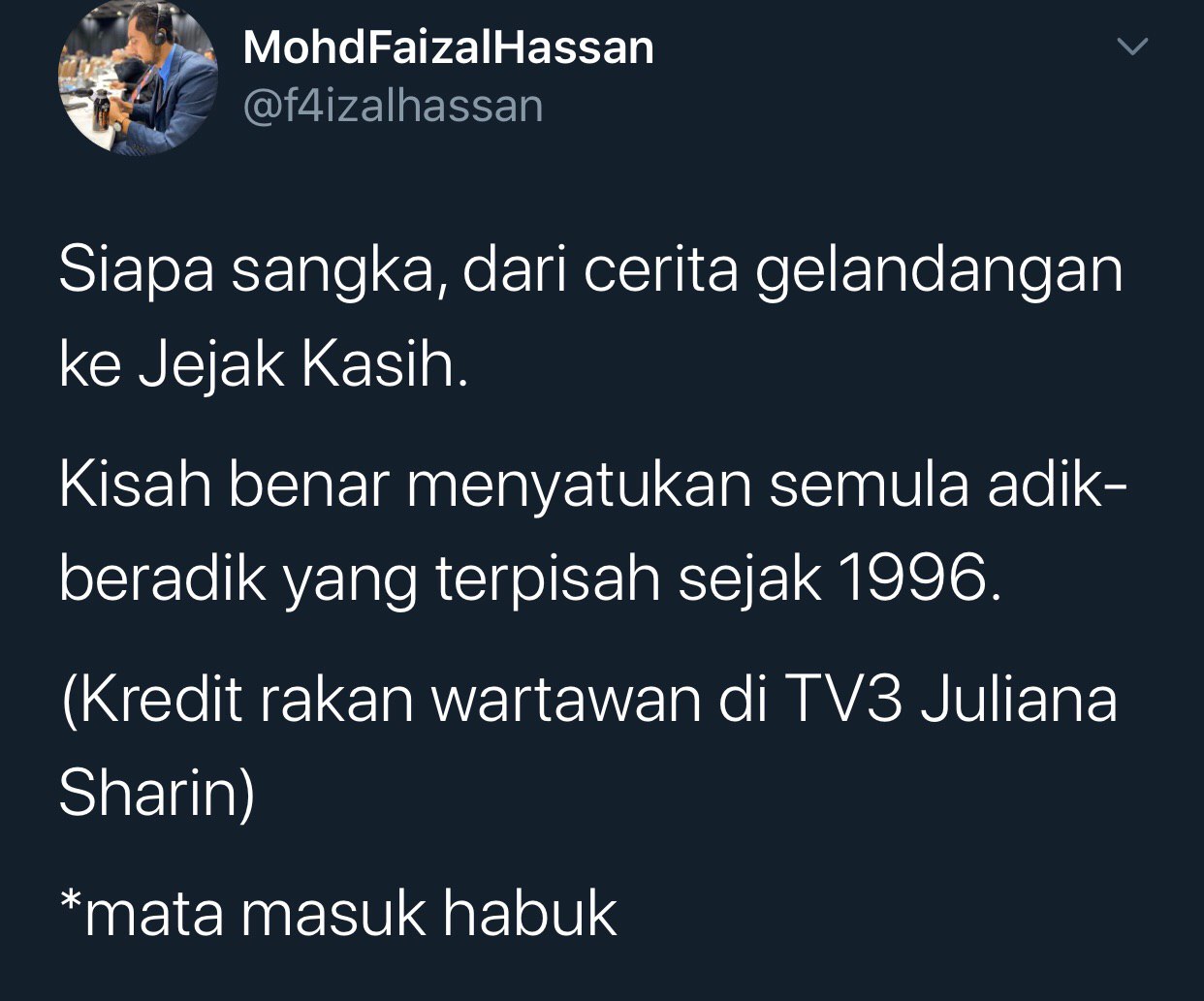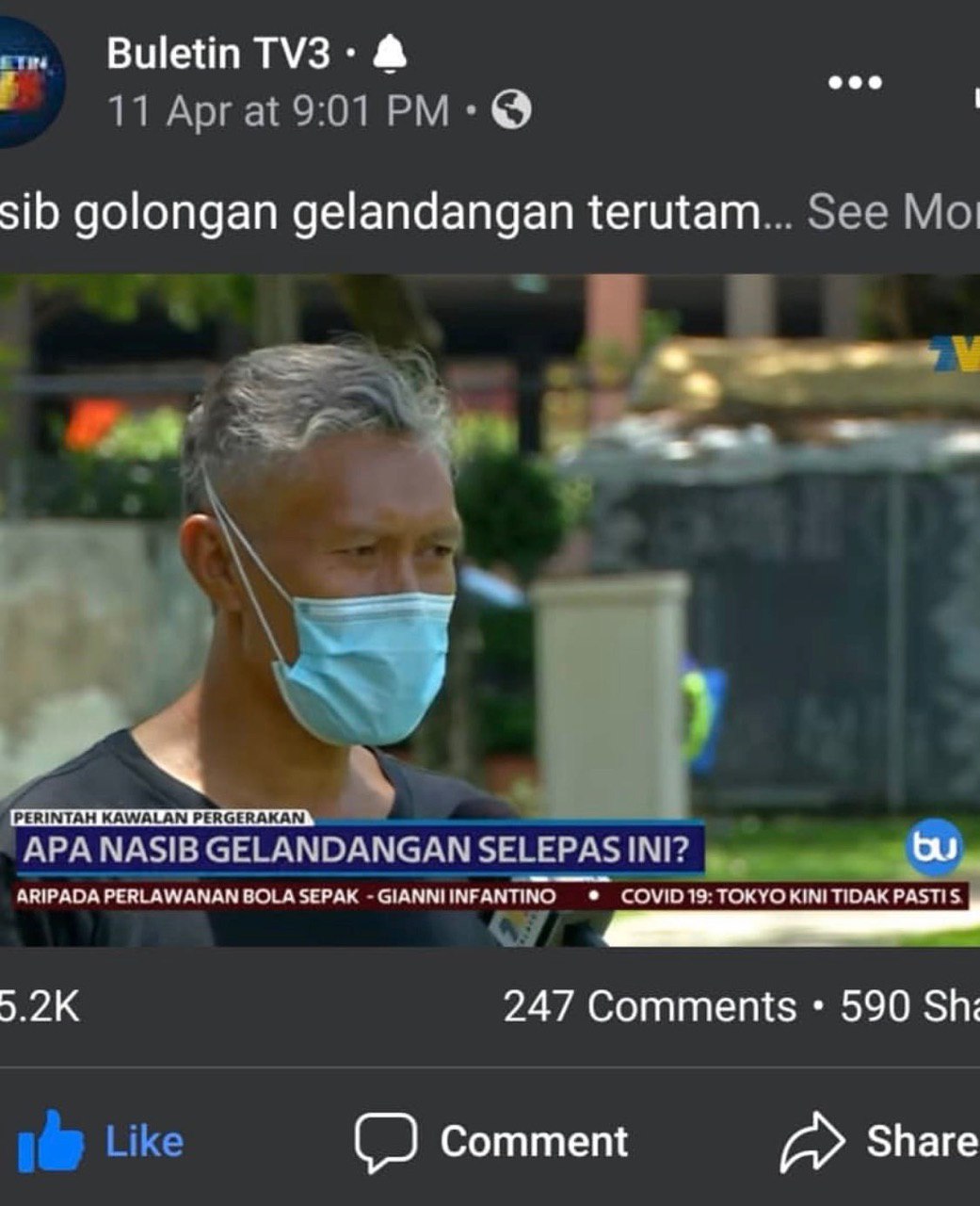 Melalui laporan berita Buletin TV3 bertarikh 11 April lalu, ada menyiarkan mengenai gelandangan yang dibantu semasa pelaksanaan PKP di ibu kota dan secara kebetulan ‘Tok Penghulu’ yang dilantik bagi mengawal kumpulan ini dikenal pasti sebagai abangnya yang sudah lama terputus hubungan.