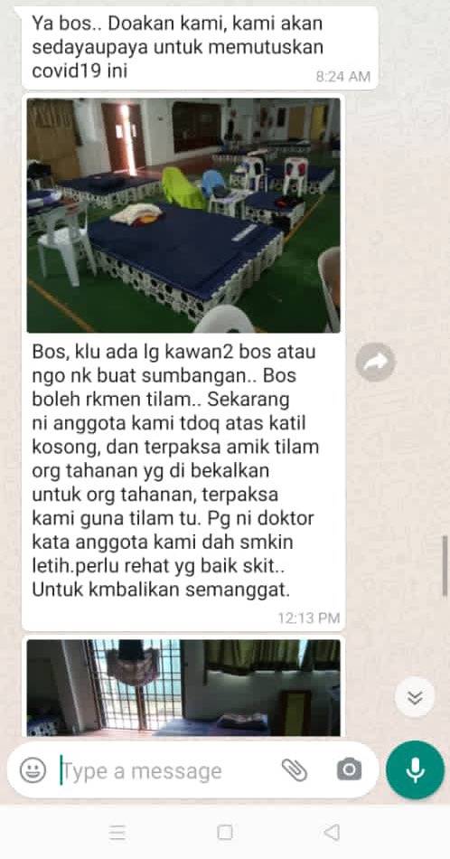 Bos, kalau ada lagi kawan-kawan bos atau Ngo nak buat sumbangan. Bos boleh rekemen tilam. Sekarang ini anggota kami tidur atas tilam kosong dan terpaksa ambil tilam orang tahanan yang dibekalkan untuk orang tahanan. Terpaksa kami guna tilam itu. Pagi ini doktor kata anggota kami dan semakin letih. Perlu rehat yang baik sikit untuk kembalikan semangat.