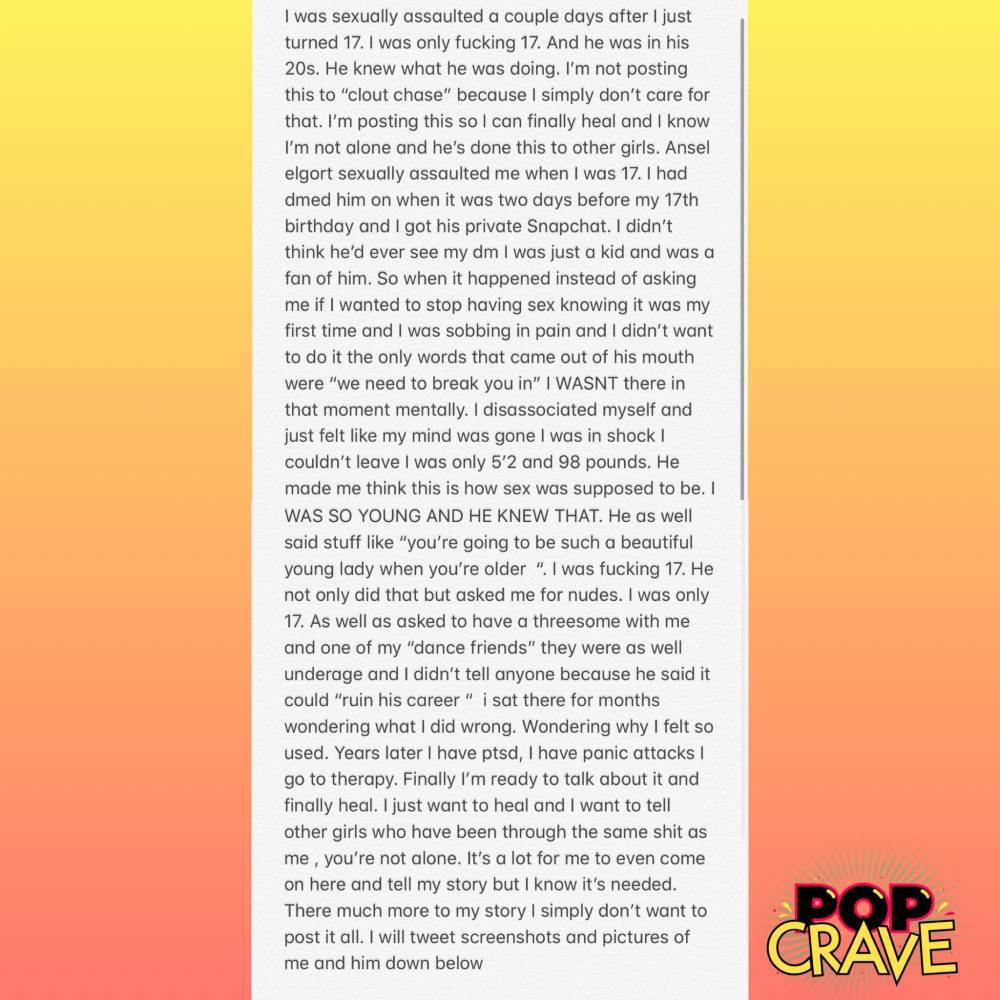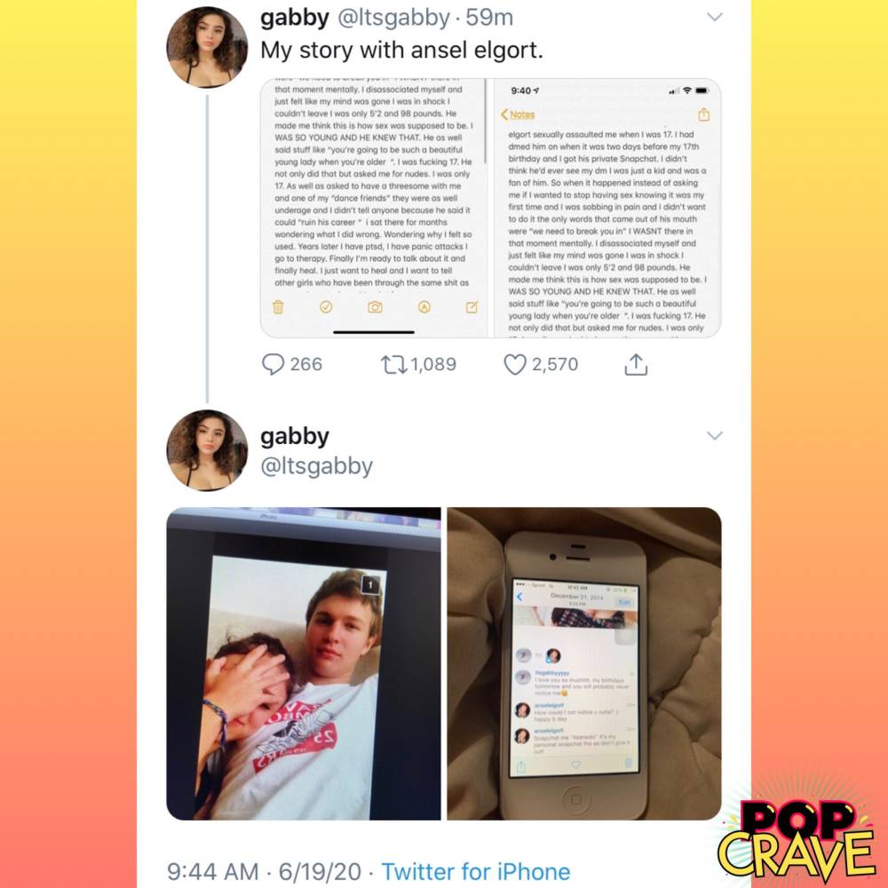 Seorang pengguna Twitter bernama Gabby menuduh Ansel pernah mencabulnya ketika dia berusia 17 tahun. Walaupun Gabby segera menyah-aktif (deactivate) akaun Twitter setelah ciapan itu menjadi viral, ramai yang sempan merekod skrin dan kembali memuat naik ciapan tersebut.