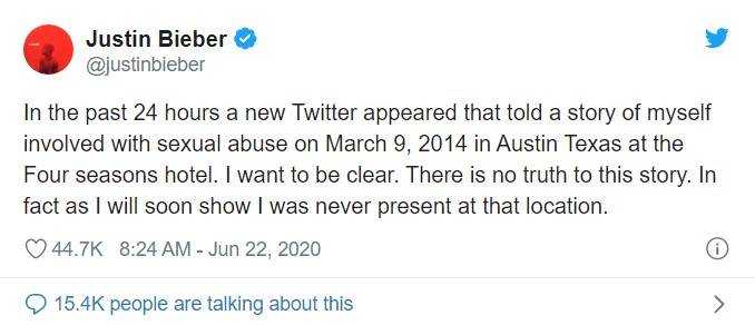 Pertuduhan pertama yang meledak semalam di Twitter sehingga mendaki carta trending nombor 1 telah melibatkan penyanyi, Justin Bieber.