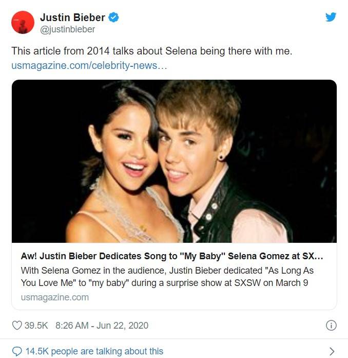 “Saya tidak pernah berada di lokasi yang disebut (Hotel Four Seasons di Austin Texas pada 9 Mac 2014). Saya hanya berada di Austin untuk menyanyikan beberapa lagu pada acara kejutan itu. Apa yang gadis (Danielle) ini tidak tahu adalah saya juga menghadiri show itu bersama teman wanita saya semasa itu, Selena Gomez.