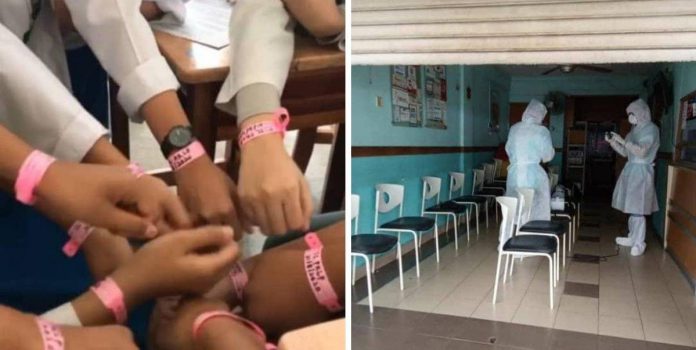 Dapat dilihat sekumpulan pelajar ini menunjukkan mereka sudah mengenakan gelang pink yang memberi makna perlu menjalani kuarantin selama dua minggu di dalam rumah dan hanya perlu berkurung di dalam bilik tanpa bertemu ahli keluarga lain.