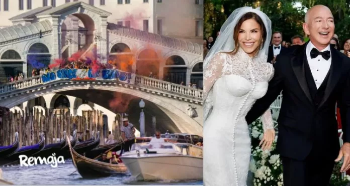 Lapor media, ratusan orang ramai berarak di sekitar Venice untuk menolak acara perkahwinan tersebut dengan sepanduk berbunyi, ‘Kisses Yes, Bezos No’ dan ‘No Bezos, No War’.