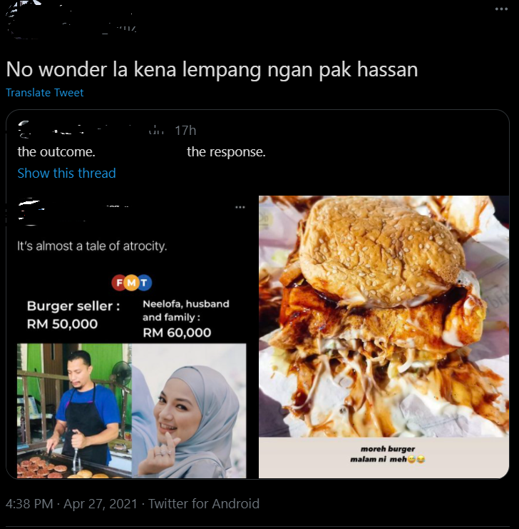 Isu Neelofa dikompaun telah hangat di laman media sosial dimana Neelofa telah memuatnaik gambar burger di akaun Instagram miliknya seolah-olah sebagai sebuah sindiran kepada abang burger yang baru-baru ini juga telah dikompaun sebanyak RM50 ribu, dengan caption “moreh burger malam ni meh..”, ianya menimbulkan tanda tanya warga netizen apabila Neelofa secara tiba-tiba ajak moreh makan burger. Ramai mengatakan yang Neelofa “gigih” mencari gambar burger tersebut di carian Google dan memuatnaiknya. Ada yang mengatakan Neelofa mungkin tidak sengaja, tetapi ada juga mengatakan yang ianya bukan satu kebetulan.