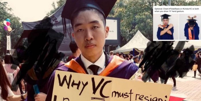 Pastinya ketika ini media sosial sedang viral dengan tindakan seorang pelajar dari Universiti Malaya, Wong Yan Ke yang membuat “hal” ketika menghadiri hari konvokesyennya sebentar tadi. Jika semua pelajar menantikan saat indah ini selepas penat lelah belajar hingga bergelar graduan namun nampaknya tindakan Wong Yan Ke menongkah arus apabila membawa naik placard meminta Naib Canselor UMDr Abdul Rahim Hashim meletakkan jawatan ekoran didakwanya memberi ucapan agak rasis ketika Kongres Maruah Melayu berlangsung minggu lalu.