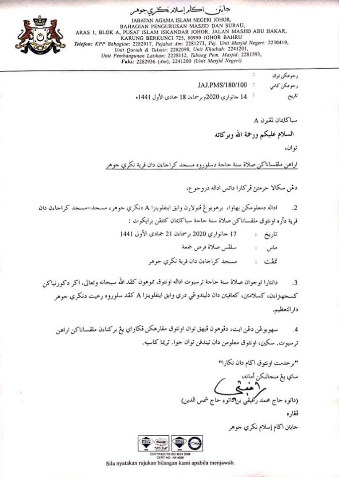 Surat rasmi yang ditulis dalam tulisan jawi itu juga memberitahu bahawa solat hajat akan dilakukan pada esok hari iaitu selepas solat Jumaat diadakan.